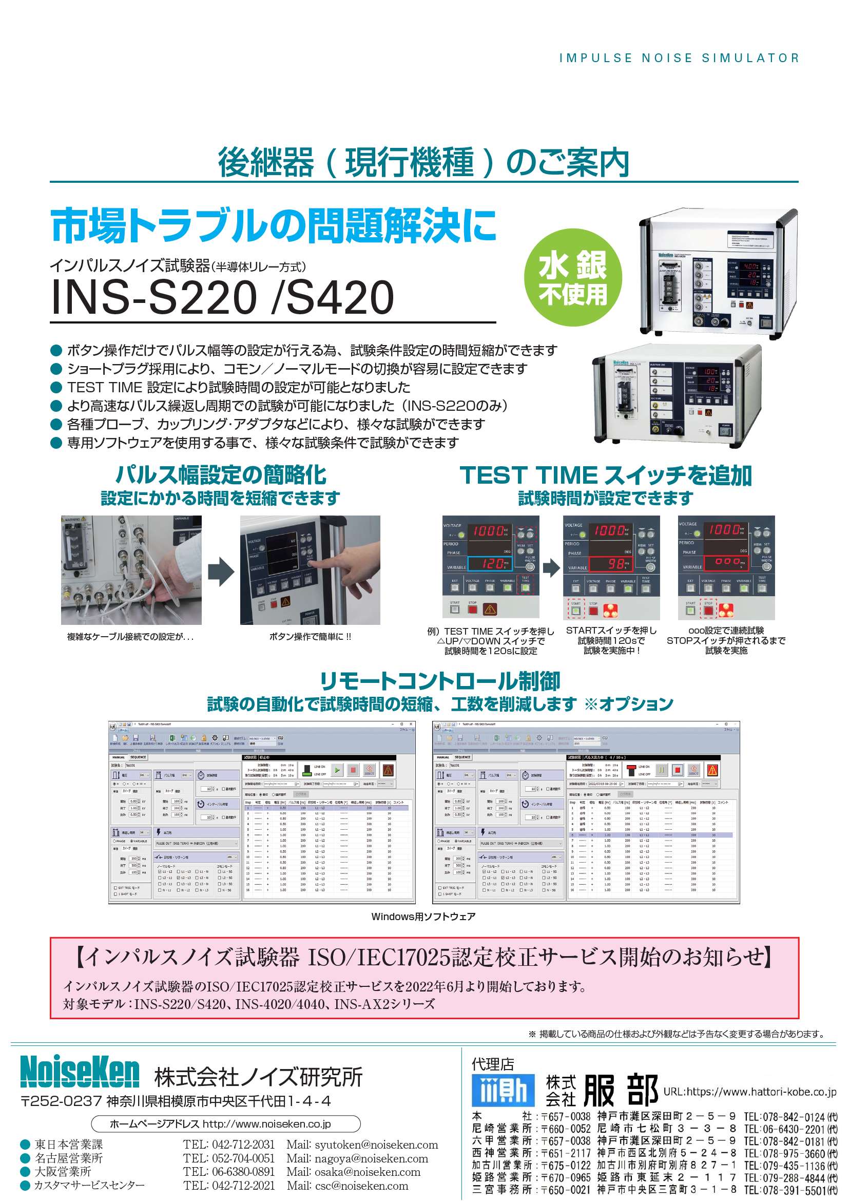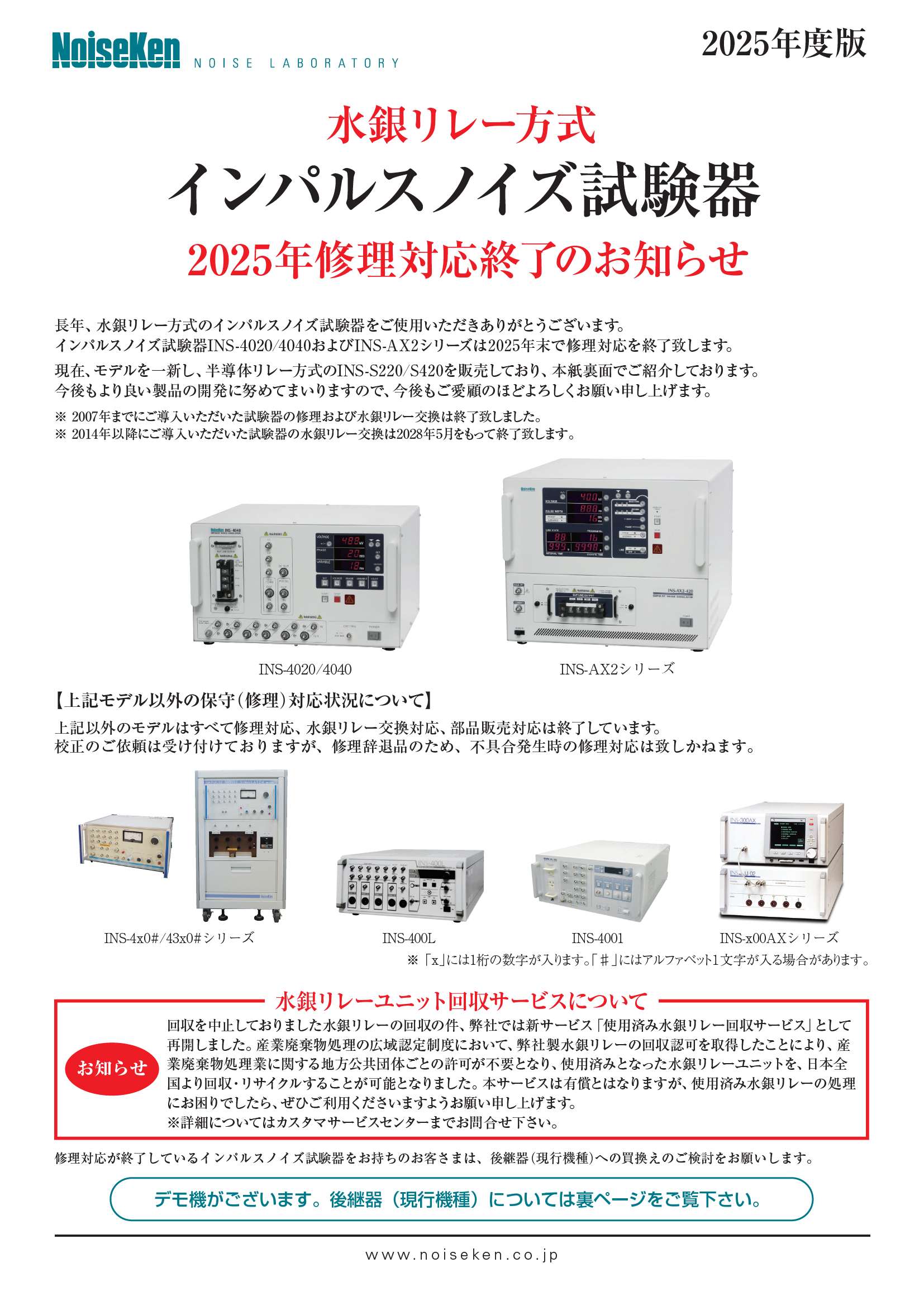 インパルスノイズ試験器(水銀リレー方式) 修理対応終了 2026.01.22 お知らせ 株式会社 ノイズ研究所のHPを見る 水銀リレー方式 インパルスノイズ試験器 2025年修理対応終了のお知らせ長年、多くのお客さまにご愛用いただいております水銀リレー方式のインパルスノイズ試験器INS-4020/4040、INS-AX2シリーズにつきまして、2025年末をもって修理対応を終了いたしました。 つきましては、当該製品をご使用中のお客様へ、現行モデルである半導体リレー方式 INS-S220/S420への買い替えをご提案いただけますようお願い申し上げます。 記事一覧に戻る